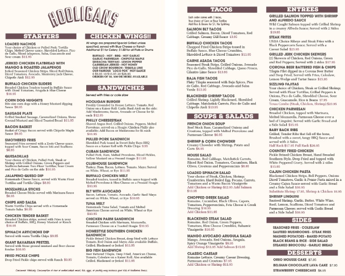 We have a great food menu and an extensive beer lineup (100 brews with 50 on tap!) In addition, Hooligan's will feature their Award Winning wings, burgers, salads, entrees and more.